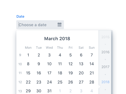 Date Picker is an input field that allows the user to enter a date by typing or by selecting from a calendar overlay. See Date Picker